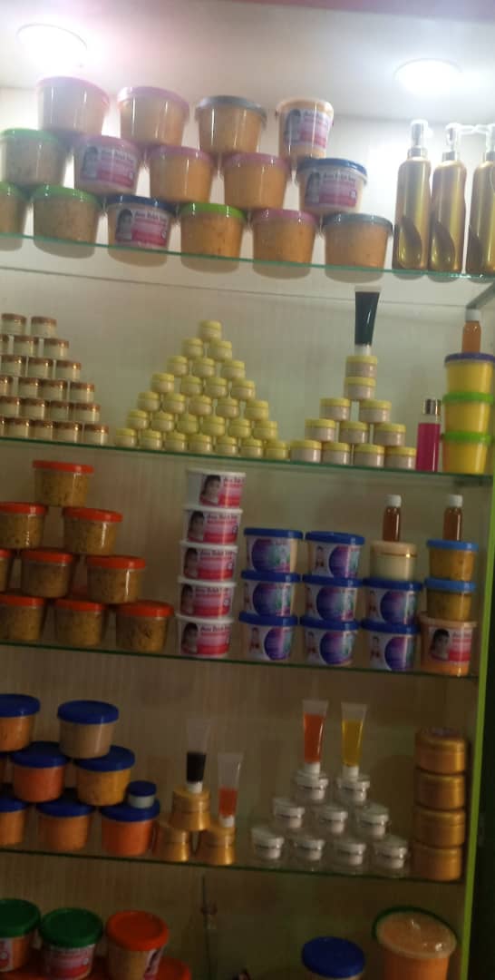 Vente de produits cosmétiques et friperies au grand marché au Togo.
