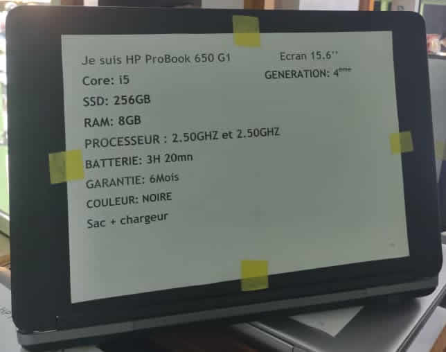 Ordinateur Portable OCCASION HP ProBook 650 G1/ OCCASION /8GB de RAM, 256Go SSD / Core i5/ 4ième Génération PROCESSEUR 2.50 ghz BATTERIE / 3H20mn GARANTIE : 6 mois Couleur noire Sac + Chargeur Economique et MOINS CHER!!!